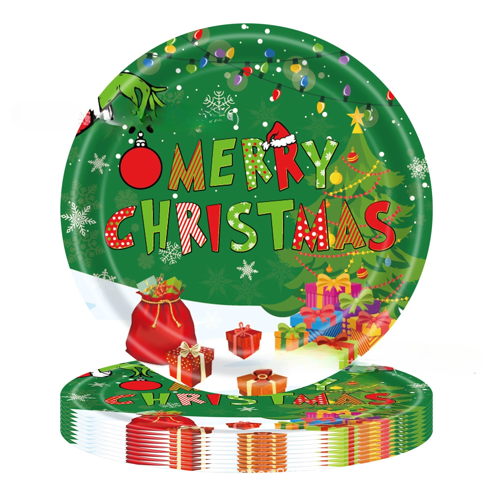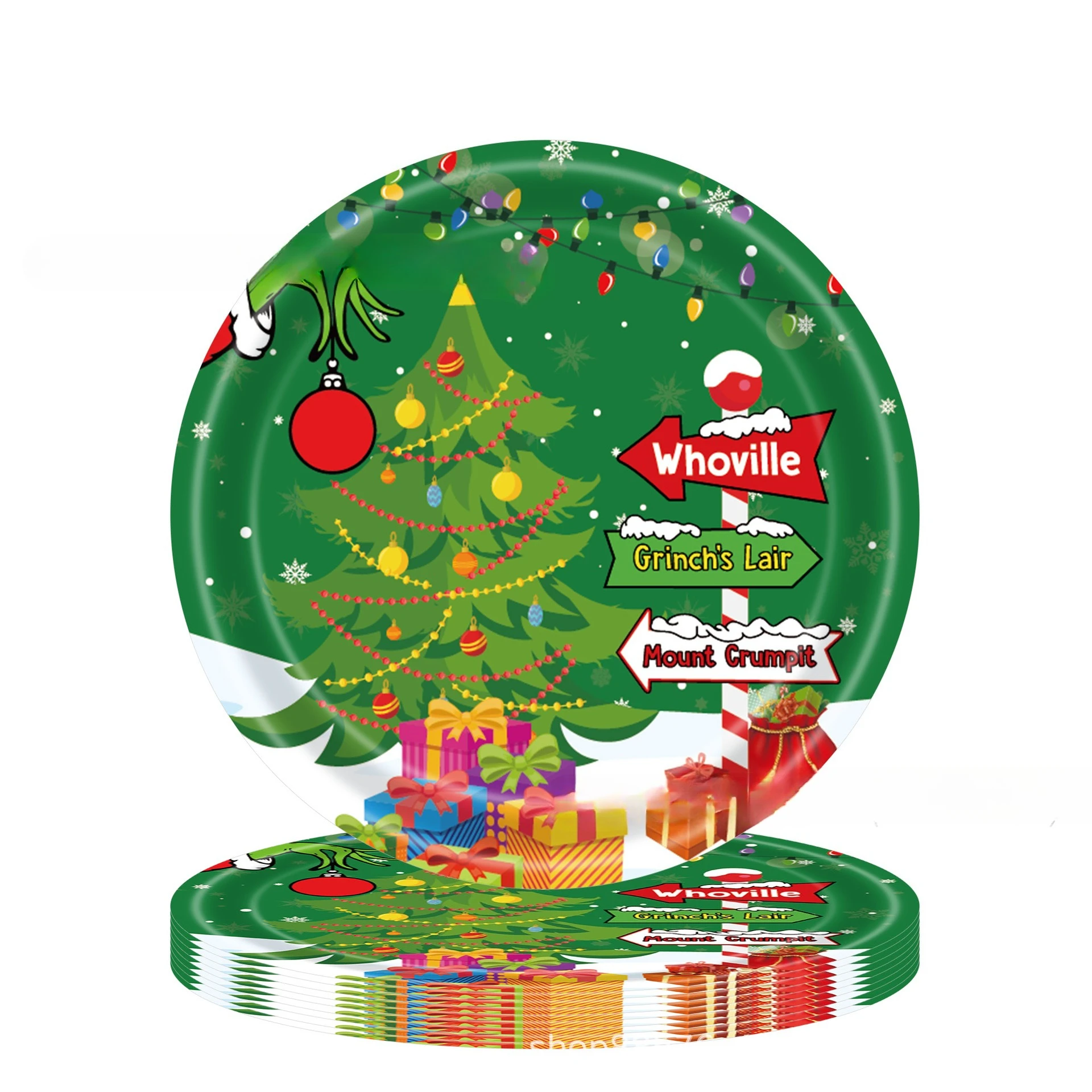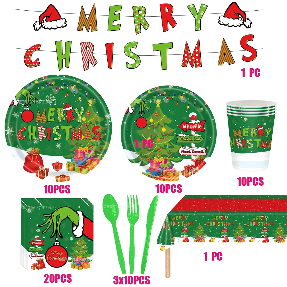 82Pcs Christmas Theme Grinch Party Tableware Set Paper Plates Cups Banners Tablecloth Merry Christmas Decorations Party Supplies